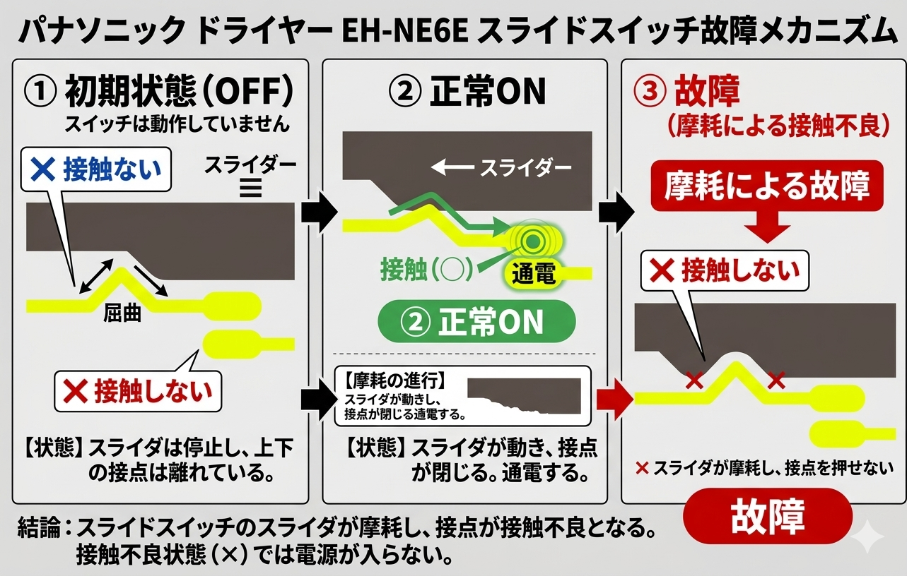 パナソニックEH-NE6Eは価格.comに18件以上の故障報告が寄せられており、特にスイッチの接触不良が多発しています。スイッチ内部の樹脂が摩耗して接点が押し込まれなくなる構造的な問題です。